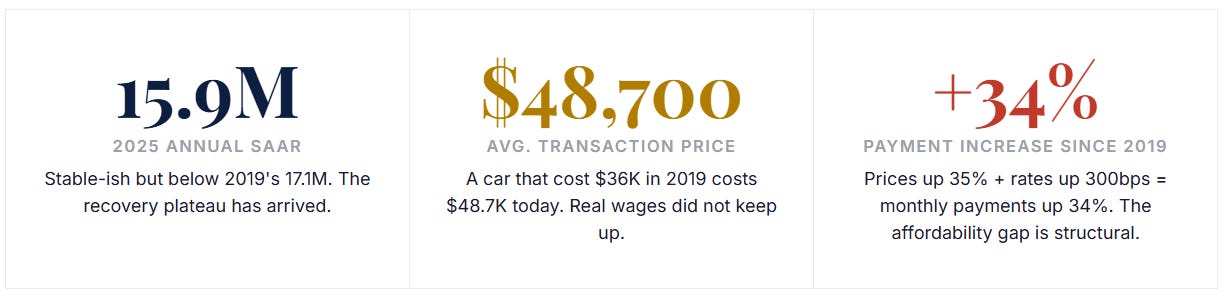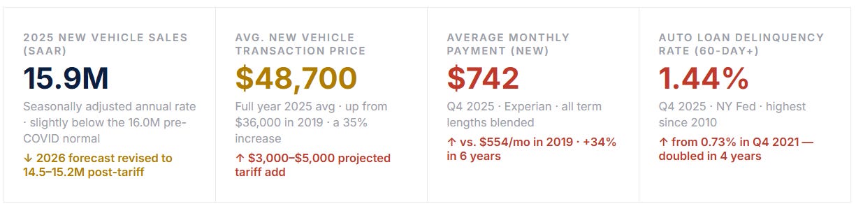 The average American now needs 46 weeks of median income to buy a new car. Auto loan rates are above 9% for the average borrower. Repossessions have surged to their highest level since the 2009 financial crisis. A new 25% import tariff just landed on every foreign-assembled vehicle. The U.S. auto market in 2026 is a study in simultaneous extremes — and understanding it requires going beyond the headline sales numbers into the financial stress underneath.