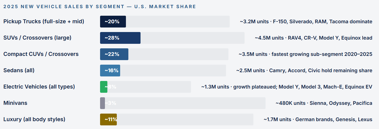 The most important structural story in new vehicle sales over the past decade is not electric vehicles, not tariffs, and not interest rates — it is the complete collapse of the traditional sedan and the dominance of the truck/SUV/crossover segment. In 2010, sedans (cars) represented roughly 50% of U.S. new vehicle sales. By 2025, that figure had fallen below 20%. The American consumer, given the choice between a car-based vehicle and a truck-based one at a similar price, overwhelmingly chooses the truck variant. This is not a media narrative — it is reflected directly in every manufacturer’s production and sales mix decisions.