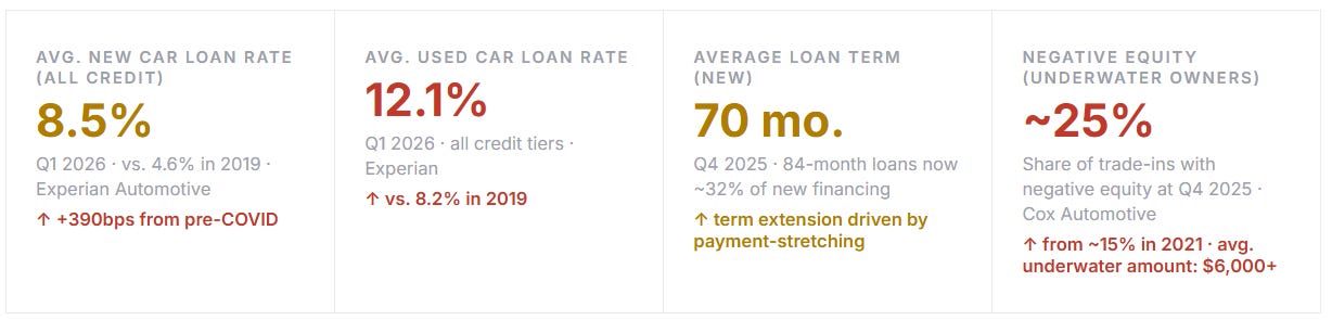The Federal Reserve’s rate cuts in late 2024 and 2025 provided modest relief — the federal funds rate came down 100 basis points in three cuts — but auto loan rates are indexed to longer-term benchmarks (typically 3- or 5-year Treasury yields) rather than the overnight rate. The transmission was slow and partial. By Q1 2026, the average new vehicle loan rate had eased to approximately 8.5%, but this remains dramatically higher than the 4–5% environment of 2019–2021.