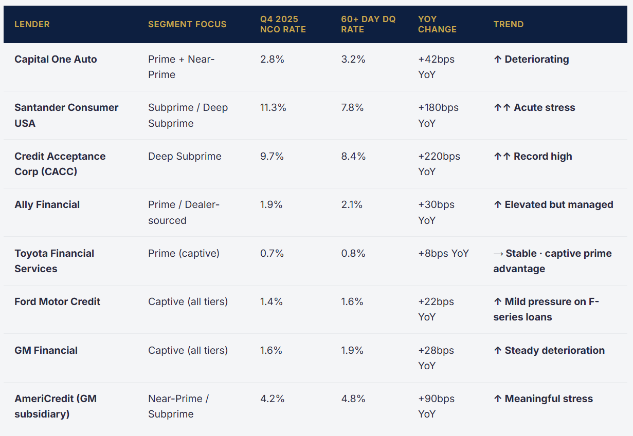 The subprime auto loan market ($500B+ in outstanding balances) is flashing the most acute stress signals in the consumer credit complex. Annualized net charge-off rates at major auto lenders — Capital One Auto, Santander Consumer USA, Credit Acceptance Corporation — have risen to 8–11% on subprime portfolios, double their 2019 levels. The KBRA Auto Loan Index for subprime shows 60+ day delinquencies at 6.2% in Q4 2025, the highest in the index’s history. Capital One, the largest bank auto lender, disclosed that auto loan net charge-offs rose 40bps year-over-year in Q4 2025. Santander Consumer’s subprime book saw charge-offs above 11% annualized. These are not pre-crisis warning signs — these are crisis-level numbers, confined currently to the subprime segment. The question is whether they stay there.