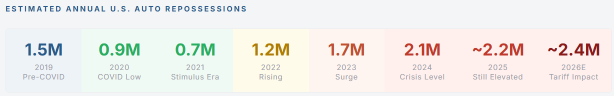Repossession data is among the most lagging and least-publicized indicators in consumer finance, but it is among the most economically revealing. Lenders do not typically publicize repo rates; the data emerges from credit bureau reports, lender disclosures, and industry tracking firms like Cox Automotive, S&P Global Mobility, and repossession industry associations. What that data shows for 2024–2025 is unambiguous: auto repossessions surged to their highest level since the aftermath of the 2008 financial crisis.