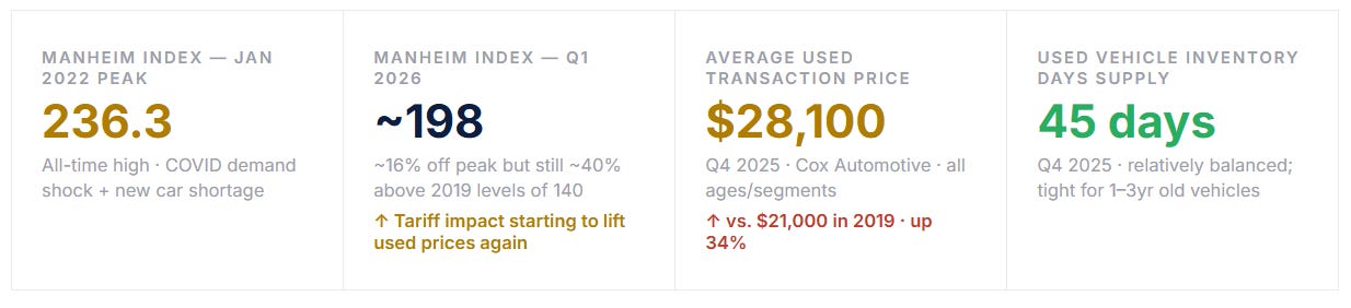The tariff shock is creating a secondary used market dynamic worth watching. If new vehicle prices rise $3,000–$8,000 due to import tariffs, demand that would have flowed into new vehicles shifts to used. This incremental used-market demand arrives at precisely the moment when used inventory is already lean (low new-vehicle production during COVID constrained the pipeline of 3–5 year old used vehicles that hit the market in 2023–2025). The result could be a Manheim Index re-inflation — used prices rising from tariff displacement demand rather than genuine consumer strength. Early data from April 2026 dealer auctions shows a 2–3% wholesale price uptick that analysts are partially attributing to tariff-anticipation buying.