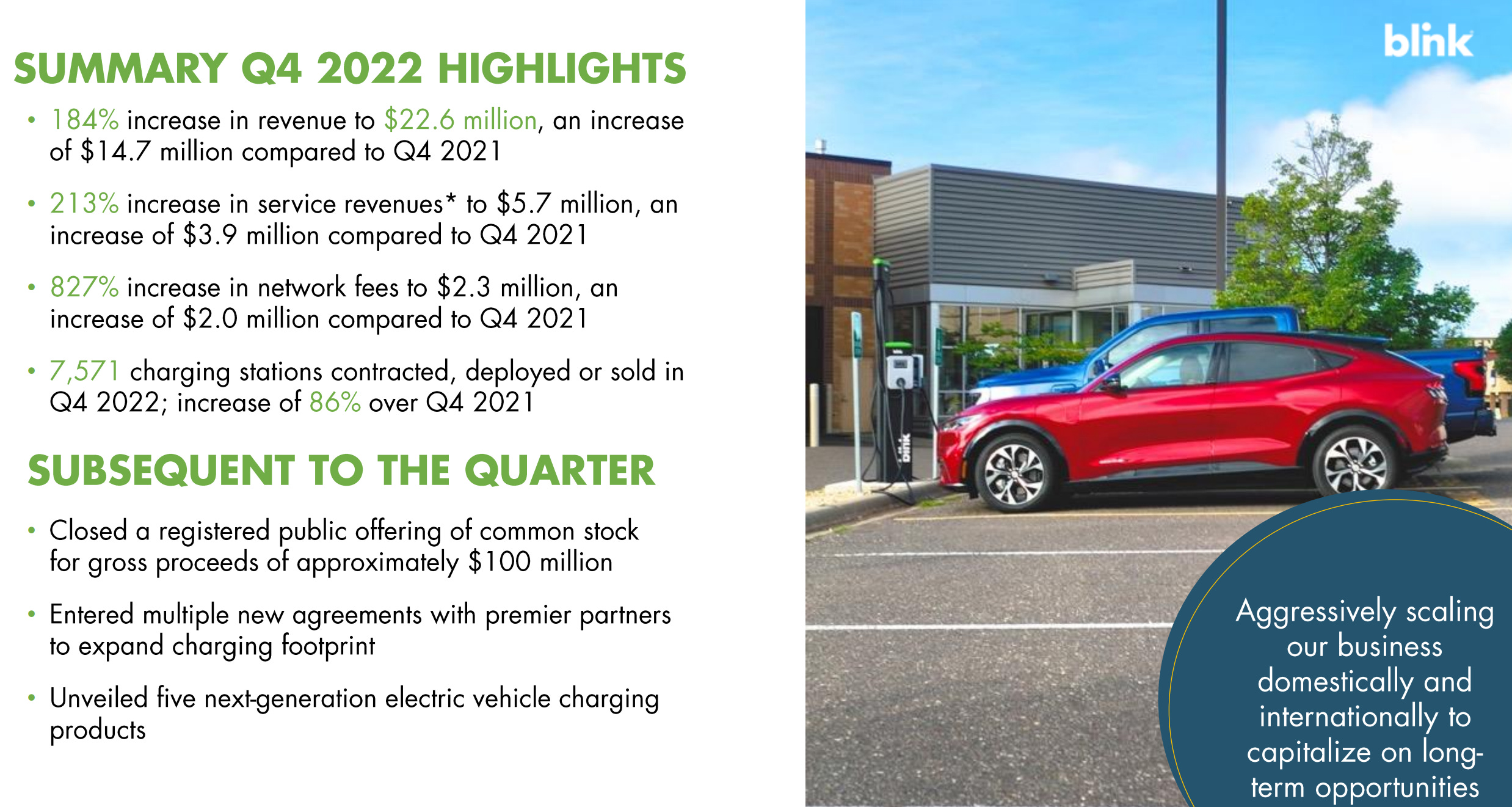 Blink increased revenue by almost threefold in 2022 compared to 2021, and service revenue grew by 213% in Q4 '22 compared to Q4 '21.
