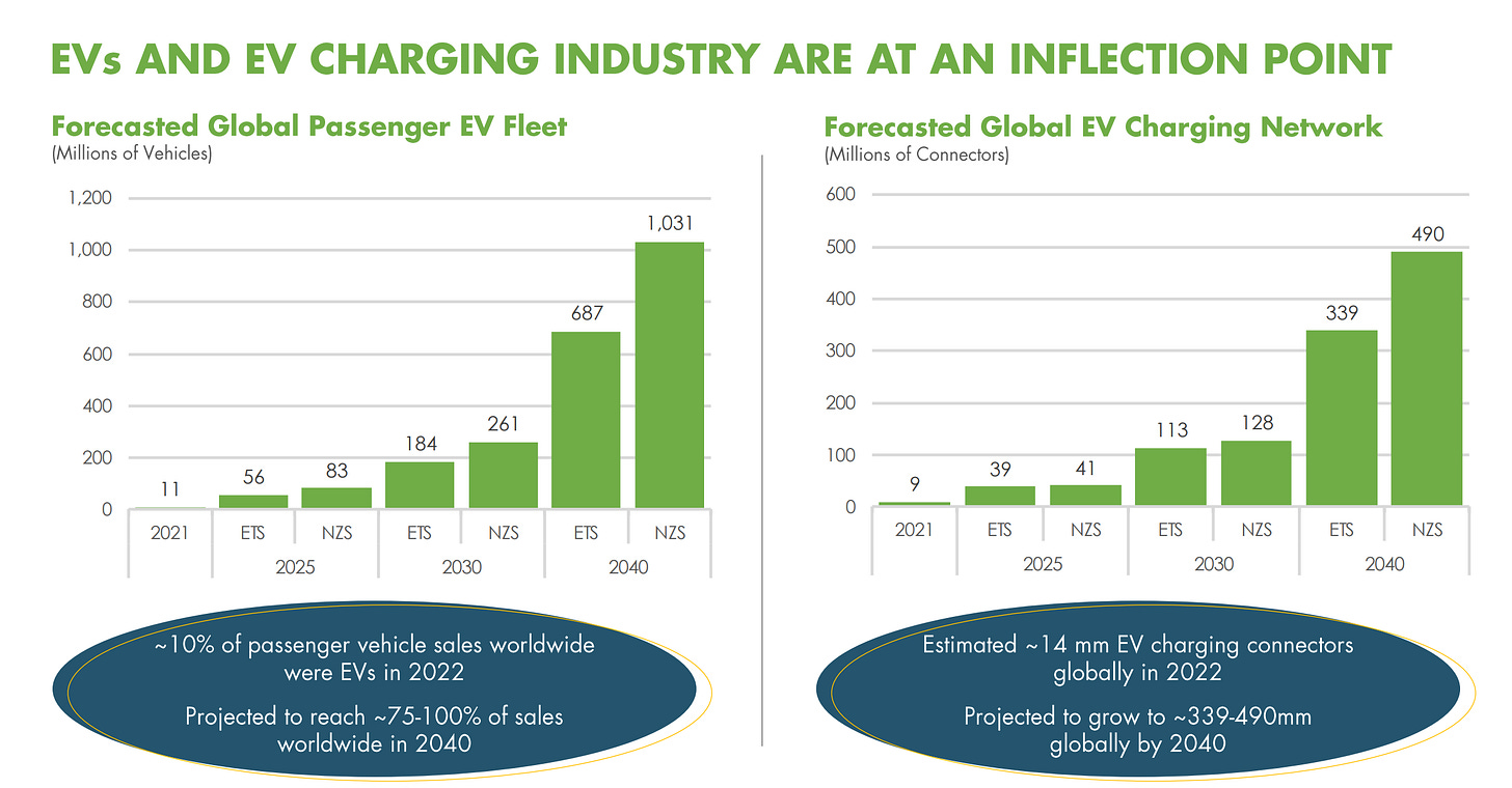 Bloomberg predicts that by 2040, we'll need anywhere between 340 million to 490 million chargers globally to meet demand, and we're not even close at about 14 million chargers.