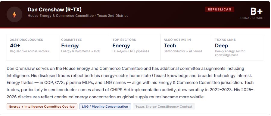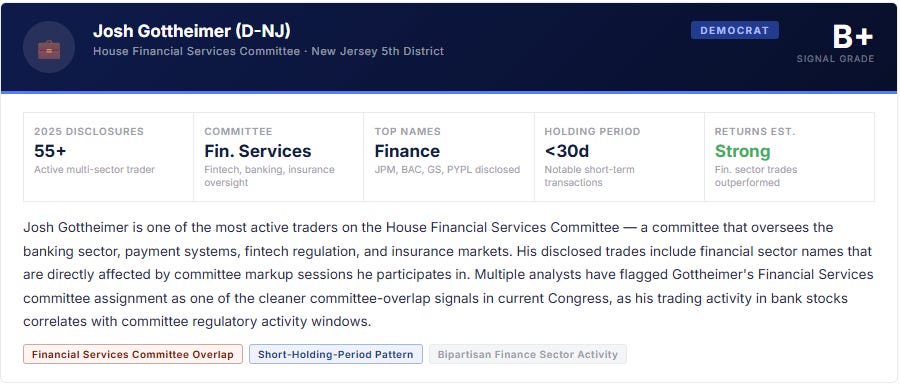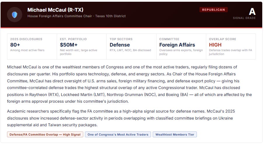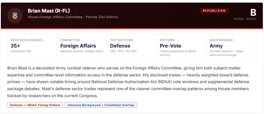 Members of Congress serve on committees that directly regulate industries, approve defense contracts, set healthcare reimbursement rates, craft semiconductor subsidy packages, and determine energy policy. A member on the Senate Armed Services Committee knows which defense programs are about to be funded before the budget is public. A member on the House Financial Services Committee hears private briefings from bank regulators before rate decisions. The STOCK Act requires them to disclose what they traded. It does not stop them from using what they heard to trade it.