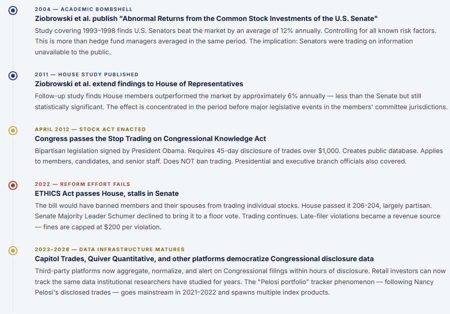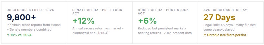 Every member of Congress is legally required to disclose stock trades within 45 days. Academics have found Senators historically beat the market by 12% annually, House members by 6%. They sit on the committees that regulate the companies they own. This report tracks every significant disclosed trade — who's buying, who's selling, and what they know that you don't.