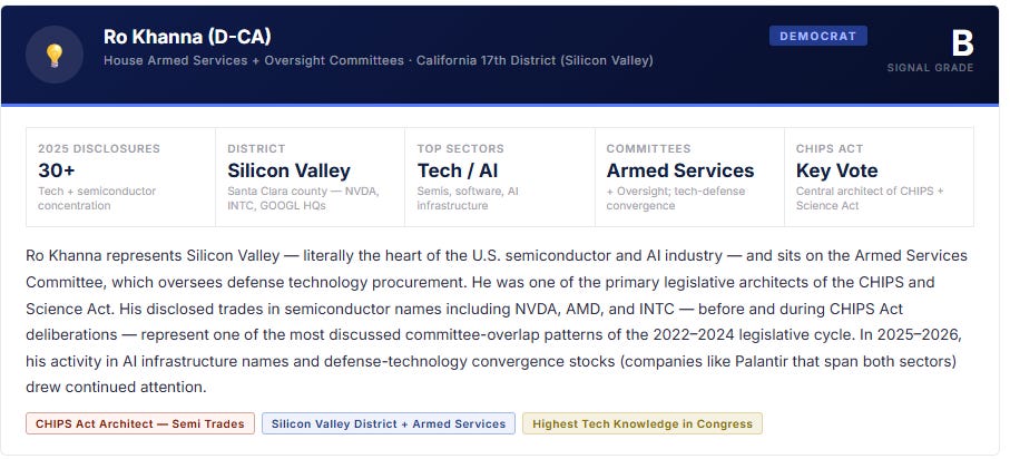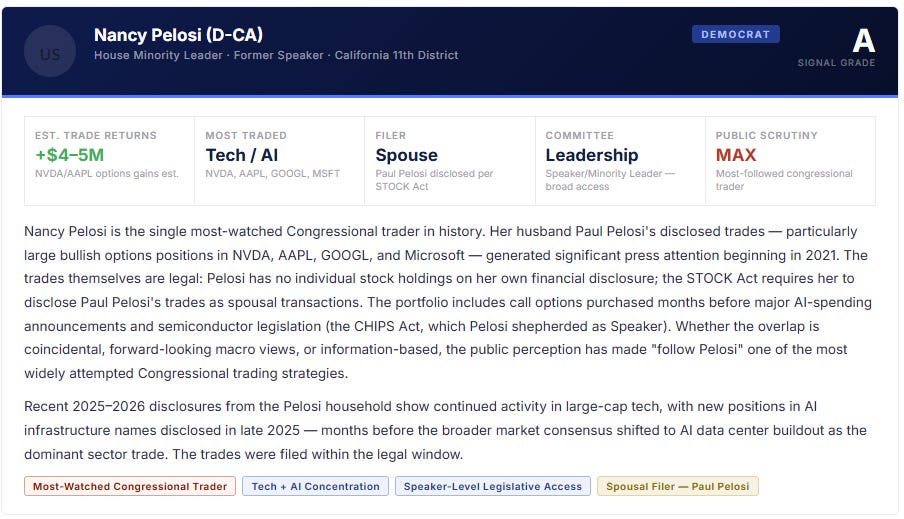 The profiles below represent the members with the most significant disclosed trading activity, highest estimated returns on their disclosed positions, or most notable committee-trade overlap. All information is drawn from mandatory STOCK Act filings.
