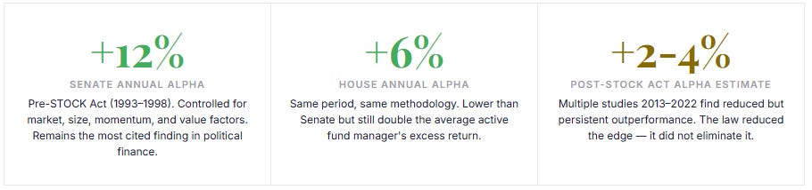 The post-STOCK Act literature is nuanced. Several studies found that the alpha compressed significantly after 2012 — the threat of public scrutiny alone appears to have changed some behavior. However, two patterns remain robust. First, purchases made shortly before a member’s committee takes legislative action in a related sector still generate abnormal returns. Second, the outperformance is concentrated in a small number of active traders, not the median member (many of whom hold index funds or have no disclosed trades at all).