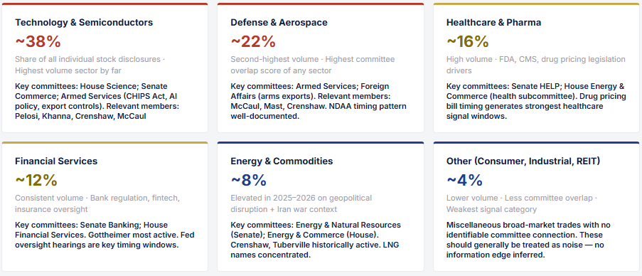 The sectors with the highest Congressional trading volume are not random. They map almost perfectly to the sectors with the most active legislative oversight — where committee information has the most advance signaling value. Technology and defense lead by volume; healthcare and financials follow. The committee-sector overlap data below is the most actionable part of any Congressional trading analysis.