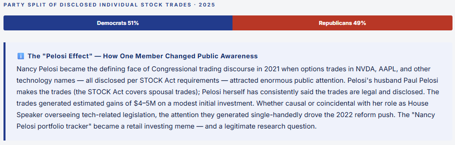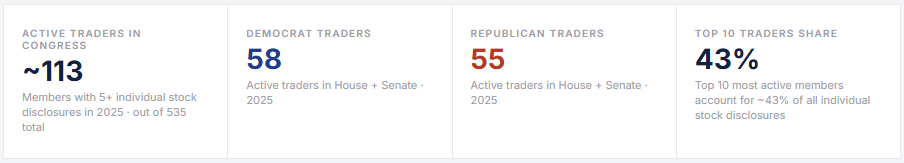 Contrary to popular perception, Congressional trading is bipartisan. Both Democrats and Republicans are active traders, and the most famous individual traders have come from both sides of the aisle — from Nancy Pelosi (D) to Tommy Tuberville (R) to Michael McCaul (R). The volume in any given year is dominated by about 10–15 members who file dozens or hundreds of disclosures, while the majority of the 535-member Congress files few or none.