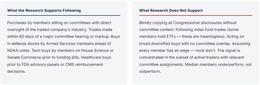 Research consistently finds that Congressional trading returns are highest in the 30-60 day window before a significant committee markup, vote, or public hearing in the member’s assigned sector. The strongest signals are: (1) purchases in defense names by Armed Services members 30–45 days before NDAA conference report; (2) tech sector purchases by Commerce/Science committee members 30–60 days before semiconductor or export control legislation moves; (3) healthcare purchases by HELP/E&C members before CMS reimbursement announcements. The signal degrades significantly outside these windows — trades far from legislative events look like ordinary portfolio management.