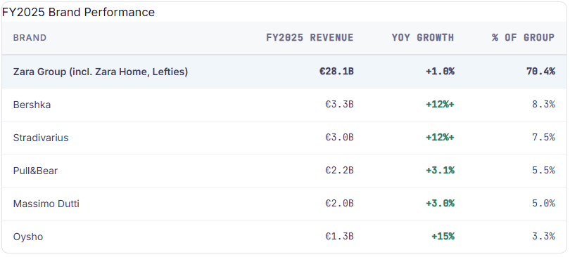 Brand-level analysis reveals a portfolio that is becoming more diversified and less Zara-dependent. Zara (including Zara Home and Lefties) generated €28.1 billion in revenue—still 70% of the group—but grew only 1% in reported terms. The real growth engines were the mid-price and youth brands: Bershka crossed €3.3 billion (up over 12%), Stradivarius topped €3.0 billion (up over 12%), and Oysho grew approximately 15%. This portfolio balance reduces concentration risk and suggests that Inditex is finding new vectors of growth beyond Zara alone.