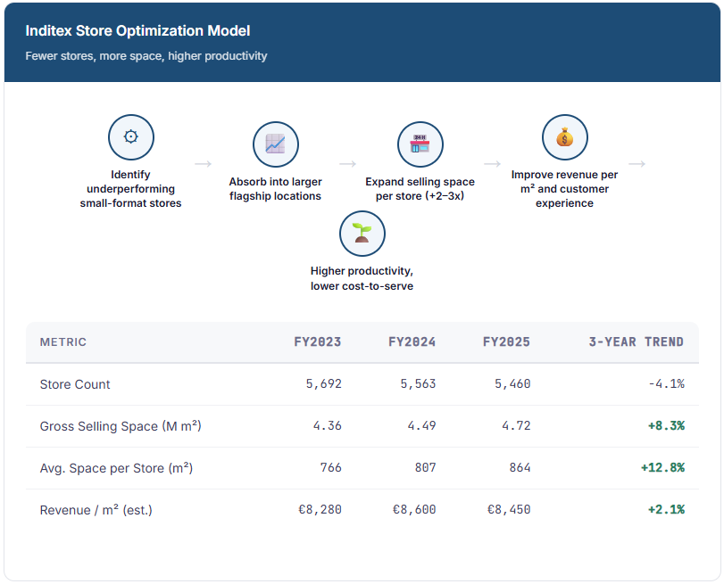 During FY2025, Inditex opened 190 new stores, completed 217 refurbishments (including 96 enlargements), and absorbed 293 smaller locations into larger, higher-productivity formats. Gross selling space grew 5.3% to 4.72 million square metres. The maths are straightforward: fewer doors, more total space, higher revenue per square metre, and a dramatically improved customer experience. Each net closure typically involves replacing one or two small-format shops in a secondary location with a single flagship or large-format store in a prime position, often doubling or tripling the selling area while consolidating operating costs.