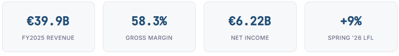 Cash generation remained exceptional: operating cash flow topped €8.2 billion, comfortably funding a €2.7 billion capital expenditure programme and a proposed dividend of €1.75 per share. The balance sheet closed the year with approximately €11.0 billion in net cash. Most strikingly, the spring 2026 trading update revealed a +9% constant-currency acceleration in store and online sales for the February 1 – March 8 window, suggesting the growth engine is gaining, not losing, momentum heading into FY2026.