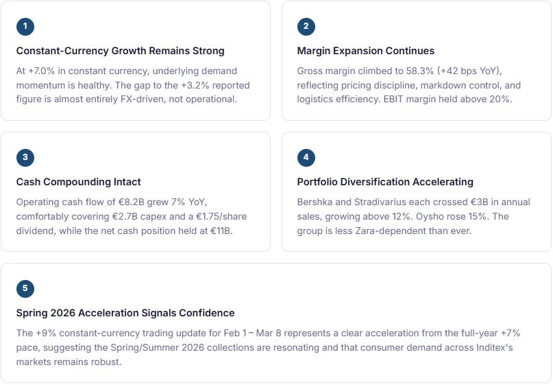 The market had broadly expected a solid set of numbers but was particularly encouraged by the early trading update: constant-currency sales growth of +9% through the first five weeks of FY2026. This acceleration from the +7% full-year pace reduced fears that Inditex was heading into a deceleration phase and re-established the narrative that the company can grow sustainably at mid-to-high-single-digit rates in real terms.