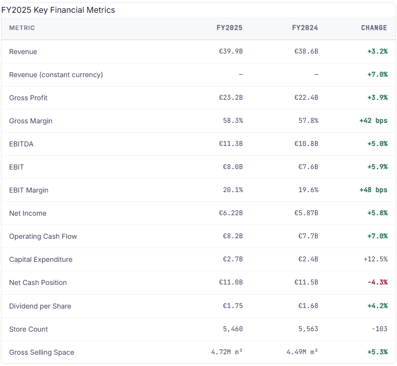 Against that backdrop, the headline numbers are unambiguous. Revenue reached €39.9 billion, up from €38.6 billion in FY2024. Reported growth of 3.2% understates the operating picture because adverse currency movements shaved roughly four percentage points off the top line. In constant-currency terms, growth was 7.0%—a pace that would be considered outstanding for a business of Inditex’s scale in any consumer environment, let alone this one.