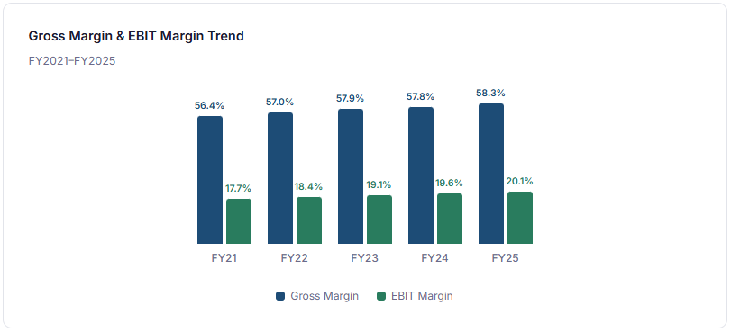 Inditex’s profitability profile is not just good relative to apparel peers—it is structurally anomalous. A gross margin of 58.3% in mass-market fashion, combined with an EBIT margin above 20%, positions the company closer to premium luxury houses than to the fast-fashion operators it is typically grouped with. Understanding why this margin quality persists, and whether it is sustainable, is essential to any serious assessment of the investment case.