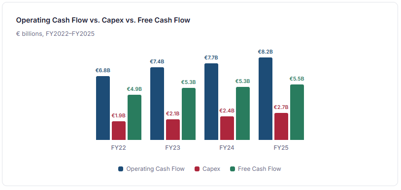 Profitability tells you how much a business earns. Cash flow tells you how real those earnings are. Inditex’s cash-flow profile is among the cleanest in global retail and provides the clearest single metric of business quality: operating cash flow of €8.2 billion in FY2025, growing 7% year-on-year, funded all investment needs and shareholder returns with room to spare.