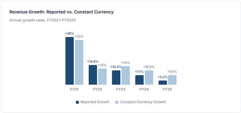 The distinction between reported and constant-currency growth is not a technicality for Inditex—it is the single most important analytical lens through which to read the top line. The company generates roughly 84% of revenue outside Spain and over half outside Europe entirely, making it acutely sensitive to currency translation effects that have nothing to do with underlying consumer demand. In FY2025, the euro’s strength against a basket of emerging-market currencies and the US dollar created an approximately four-point drag, turning what was genuinely strong operating growth into what looked like modest reported growth.