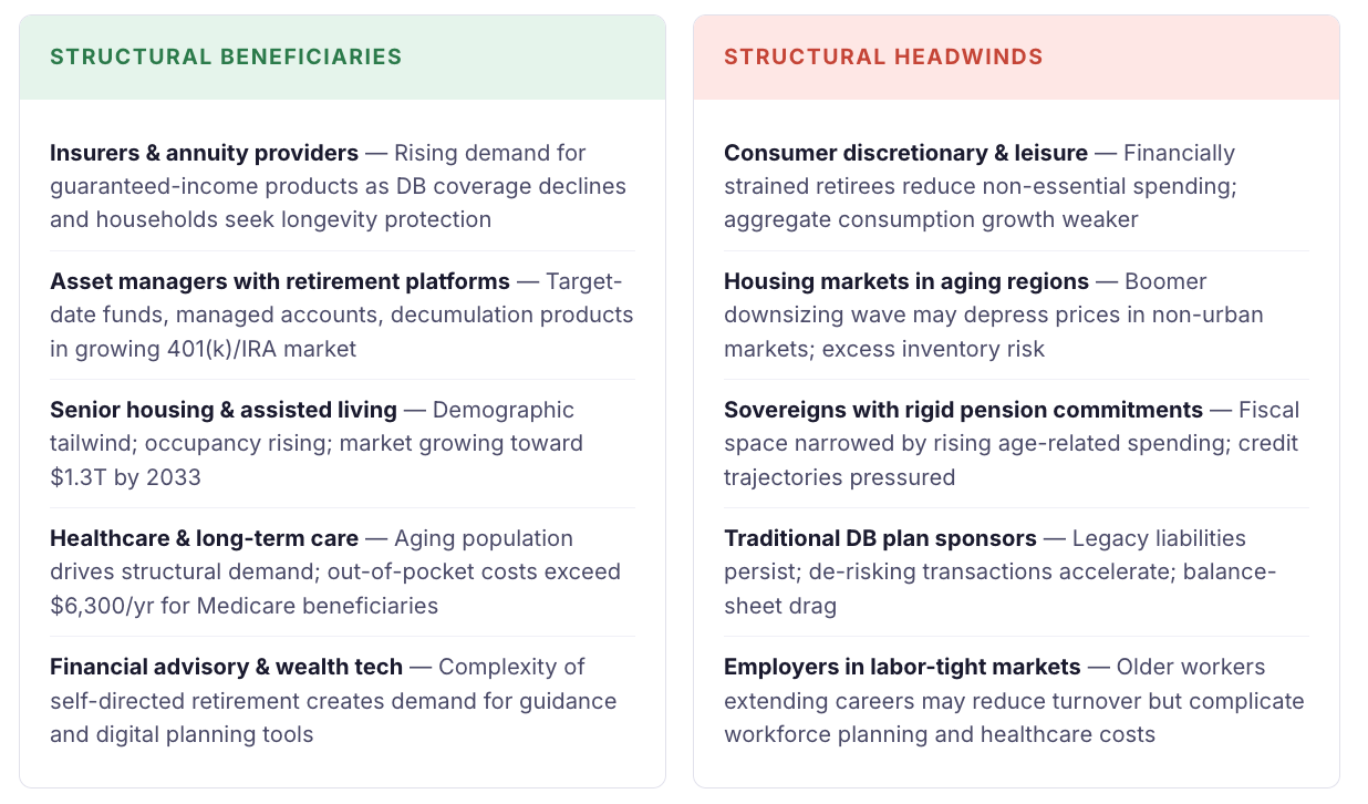 The repricing of retirement is not merely a social-policy problem. It carries significant implications for asset allocation, sector positioning, fiscal sustainability, and macroeconomic dynamics. The shift from institutional to individual retirement risk creates both demand for new financial products and structural vulnerabilities in consumption and labor markets.