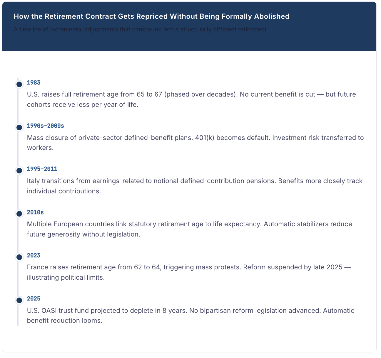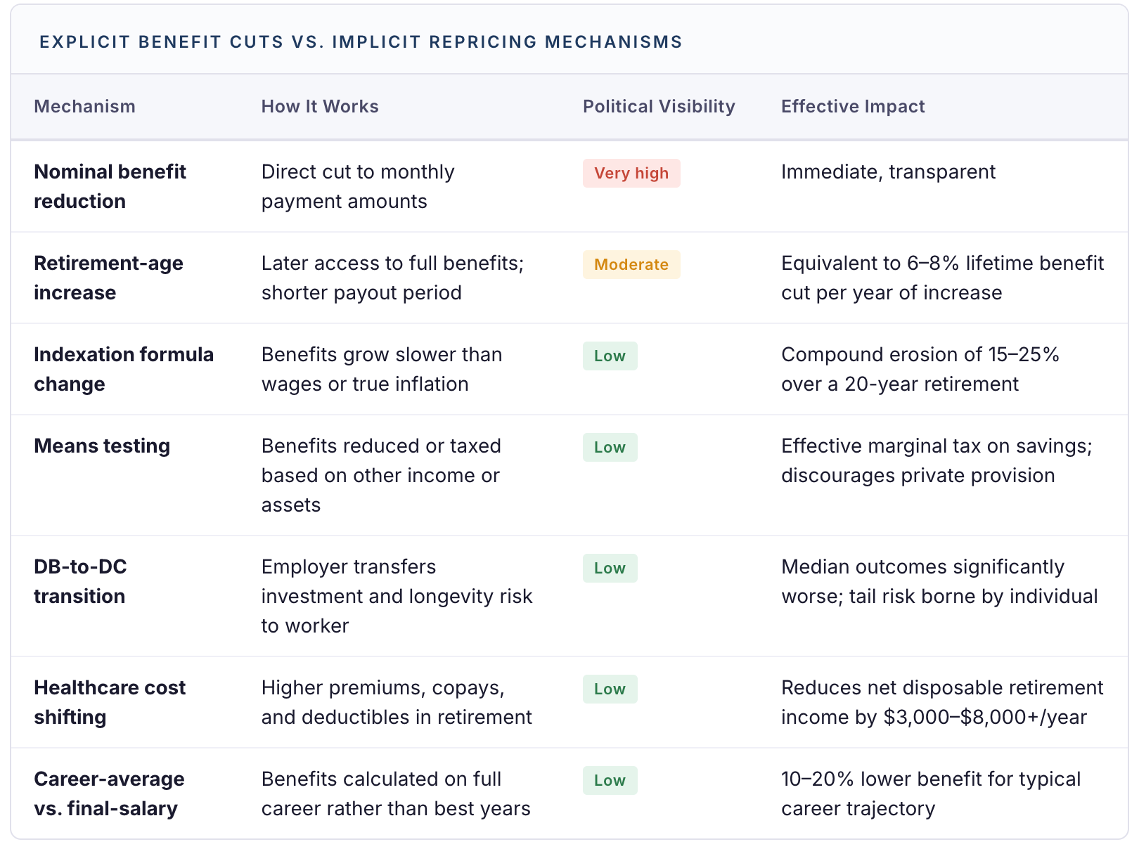 Retirement is being repriced through slower benefit growth, inflation-eroded purchasing power, rising retirement ages, and means testing — mechanisms that avoid the political cost of explicit nominal cuts.