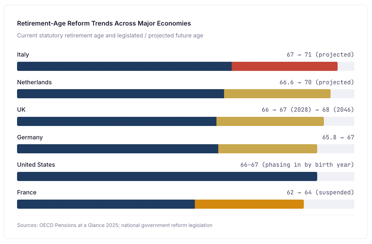 Of all the mechanisms through which retirement is being repriced, raising the statutory retirement age has become the preferred instrument of fiscal adjustment across the West. It achieves two goals simultaneously: it reduces the actuarial cost of pensions by shortening the payout period, and it increases the tax base by extending the working life. Critically, it avoids the political toxicity of nominal benefit cuts — no monthly check is reduced; instead, the age at which one can claim it is moved forward.