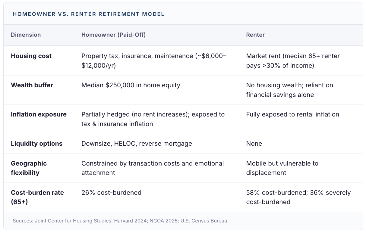 Housing has become a de facto pension asset, but it is illiquid, regionally variable, and profoundly unequal: 58% of elderly renters are cost-burdened, while homeowners hold median equity of $250,000.