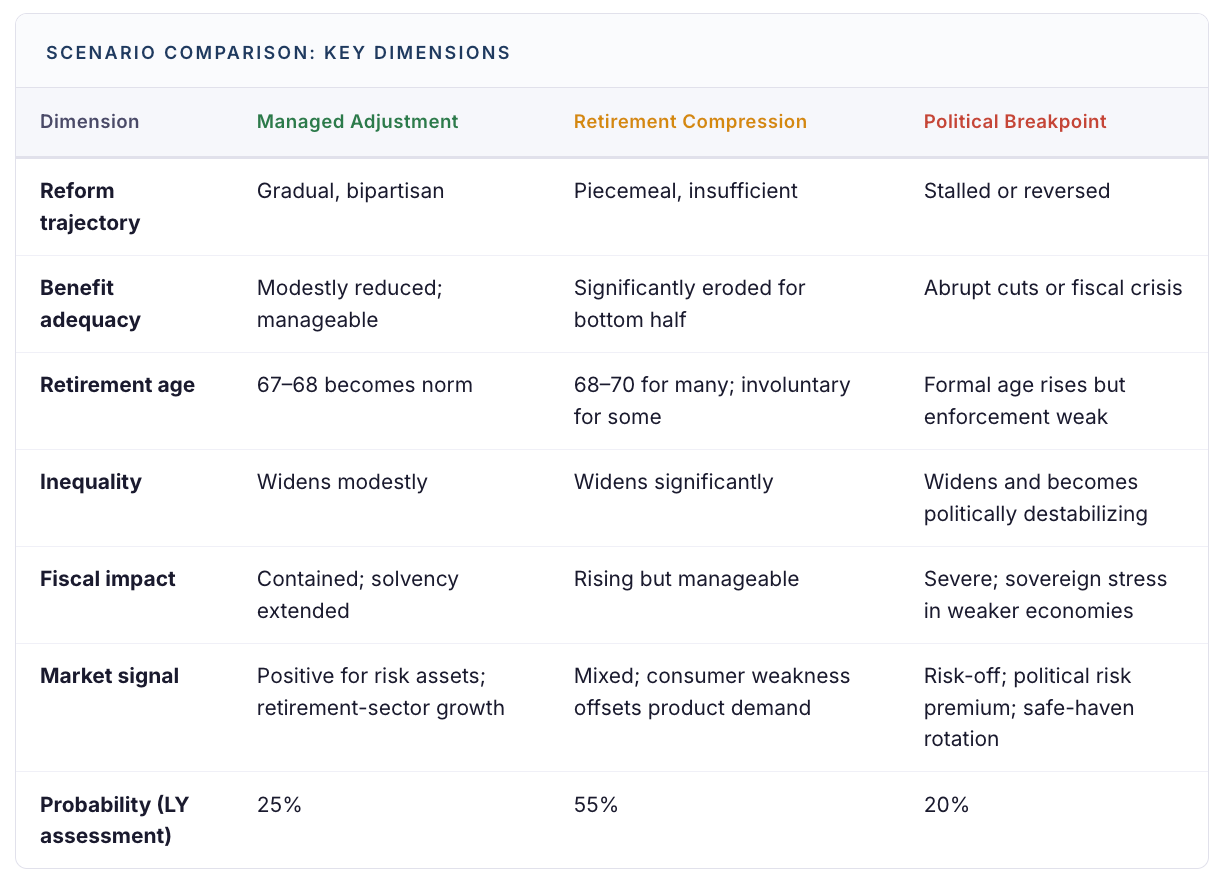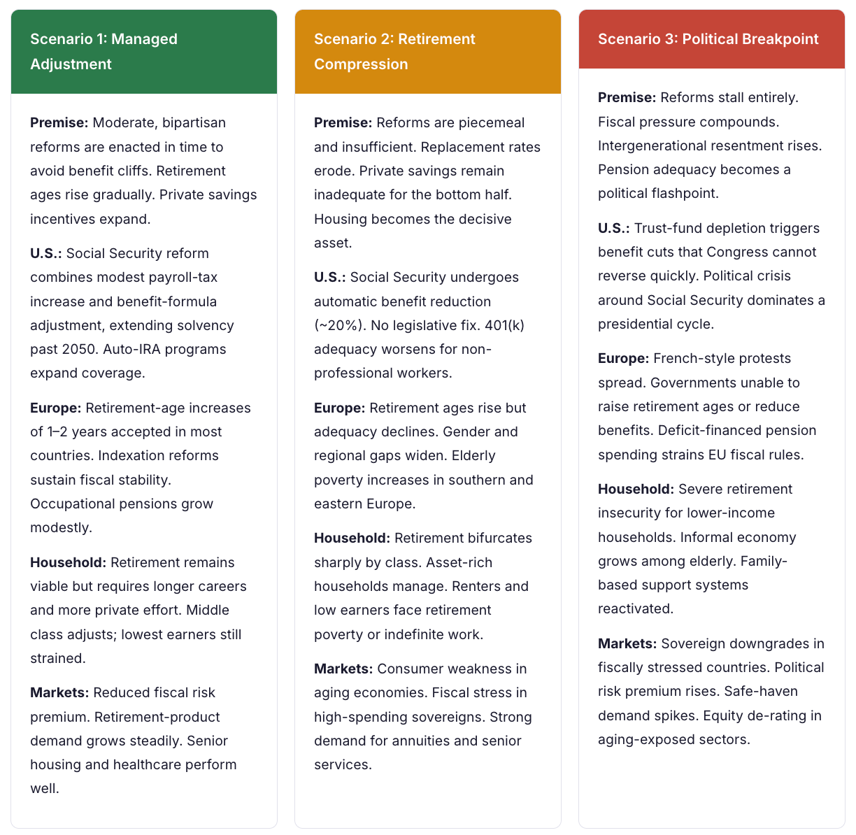 The trajectory of retirement across the West is not predetermined. Policy choices, demographic developments, and market dynamics will shape outcomes. Three scenarios frame the plausible range over the next five to ten years.