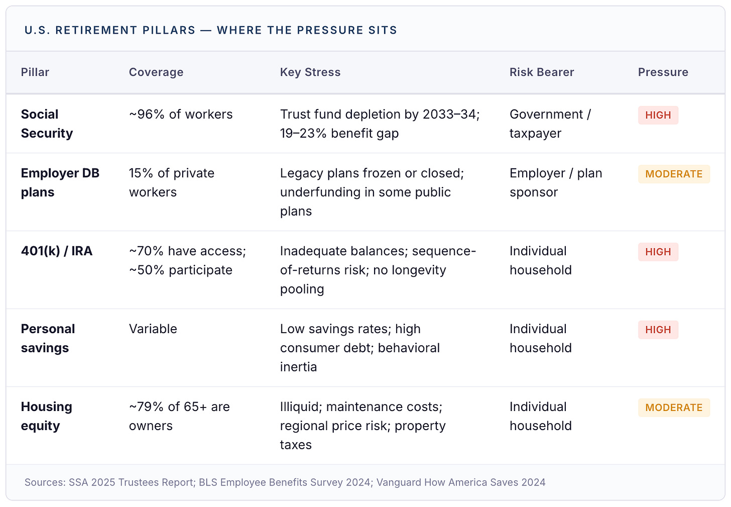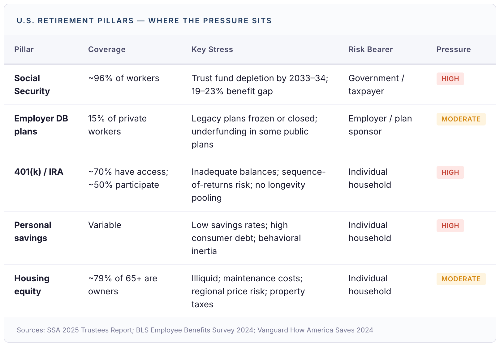 The American retirement system rests on three pillars: Social Security, employer-sponsored retirement plans, and personal savings. In theory, this produces a diversified income base. In practice, the first pillar is under demographic strain, the second has been fundamentally restructured in ways that shift risk to households, and the third is woefully inadequate for most of the population.