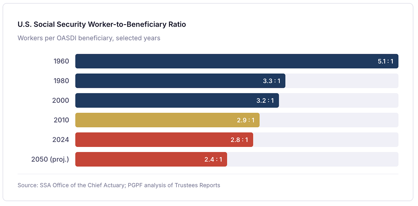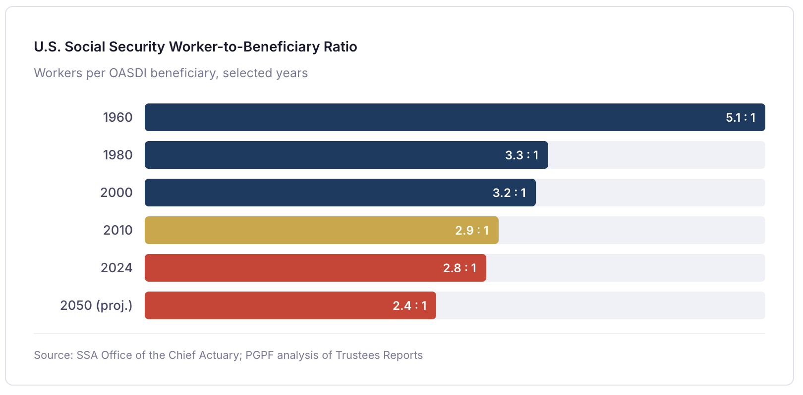 The demographic pressure is straightforward: the worker-to-beneficiary ratio has fallen from 5.1:1 in 1960 to 2.8:1 today, and it will continue to decline as the baby-boom generation ages through the system and life expectancy extends the payout period. The system was designed for a younger, faster-growing population. It now operates in a society that is older, longer-lived, and growing more slowly.