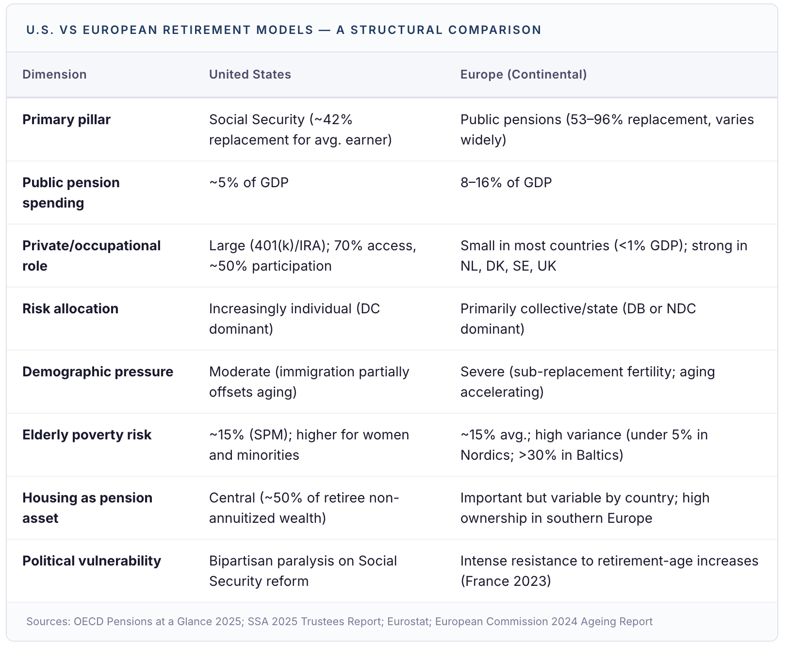 This article examines the structural pressures reshaping retirement in the U.S. and Europe, the distributional consequences of the repricing, the role of housing as a de facto pension asset, the political economy of retirement-age reform, and the market and macro implications for investors and policymakers. The central finding is that the retirement crisis is best understood not as a story of collapse, but as one of compression — and it is already well under way.
