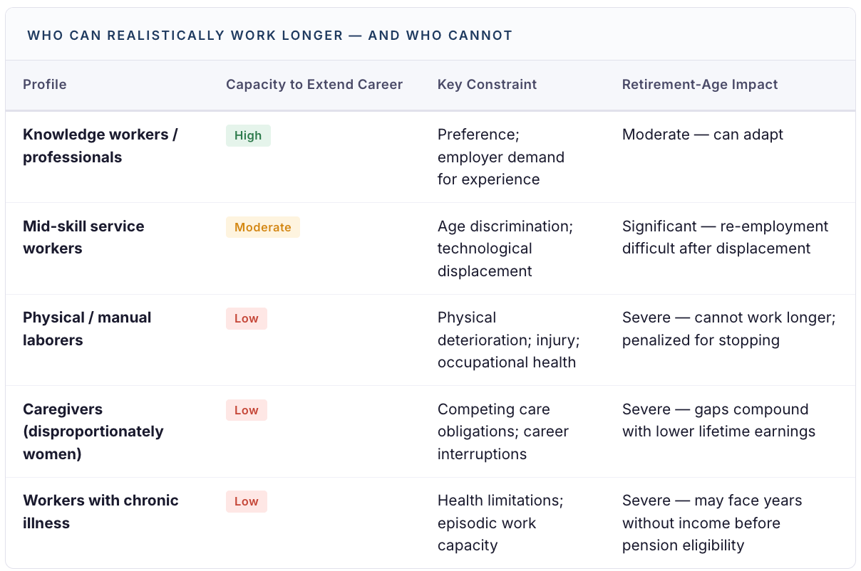Physical capacity is another underappreciated dimension of inequality. Nearly 32% of workers aged 55–64 are employed in physically demanding occupations. For these workers, the aspiration to “work longer” — the preferred policy response to retirement shortfalls — is often unrealistic. A knowledge worker can plausibly extend a career into the late 60s or early 70s. A construction worker, nurse, or warehouse operative frequently cannot. The gap between who can work longer and who must work longer is a class divide that retirement-age reform tends to obscure.