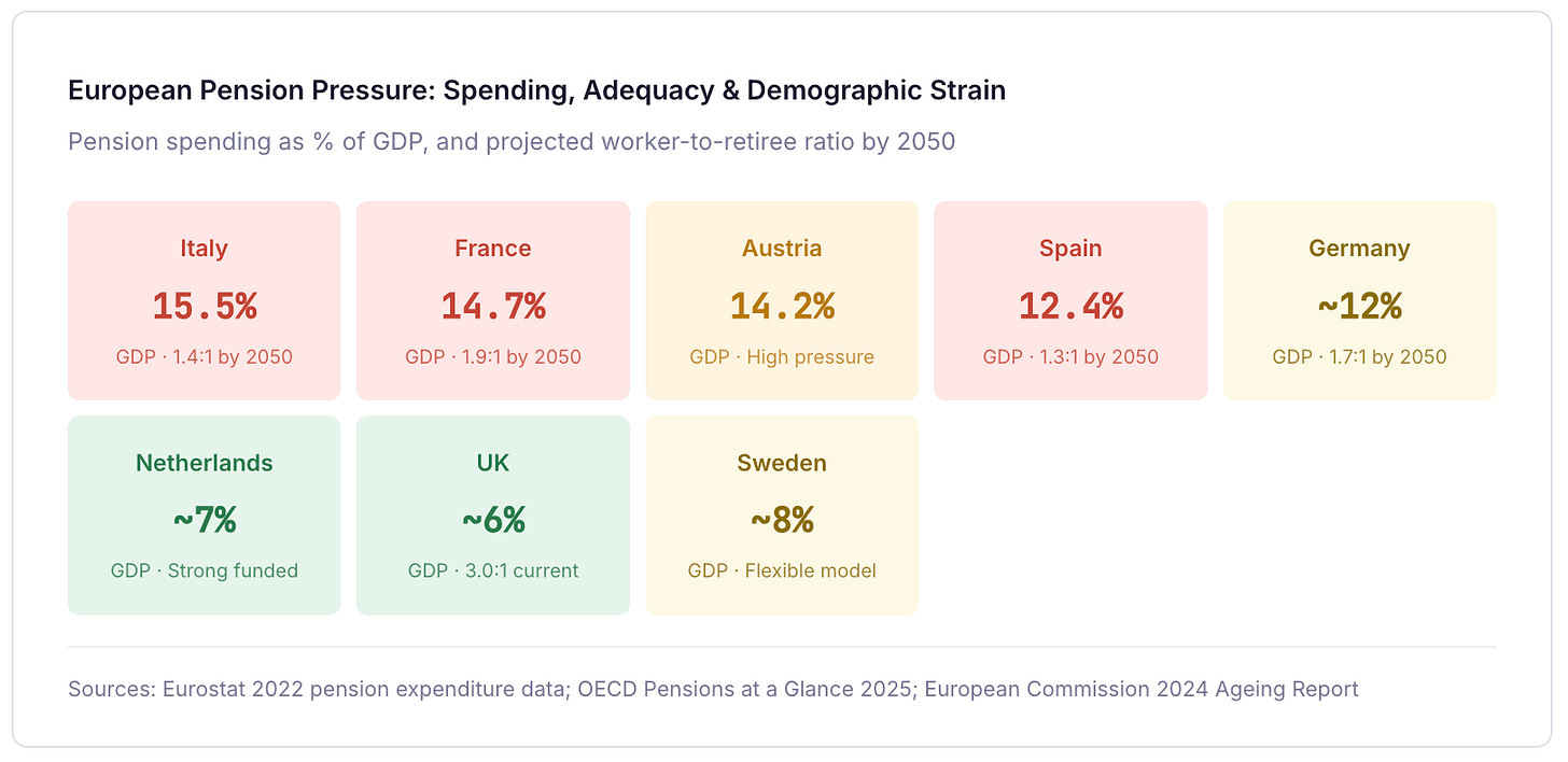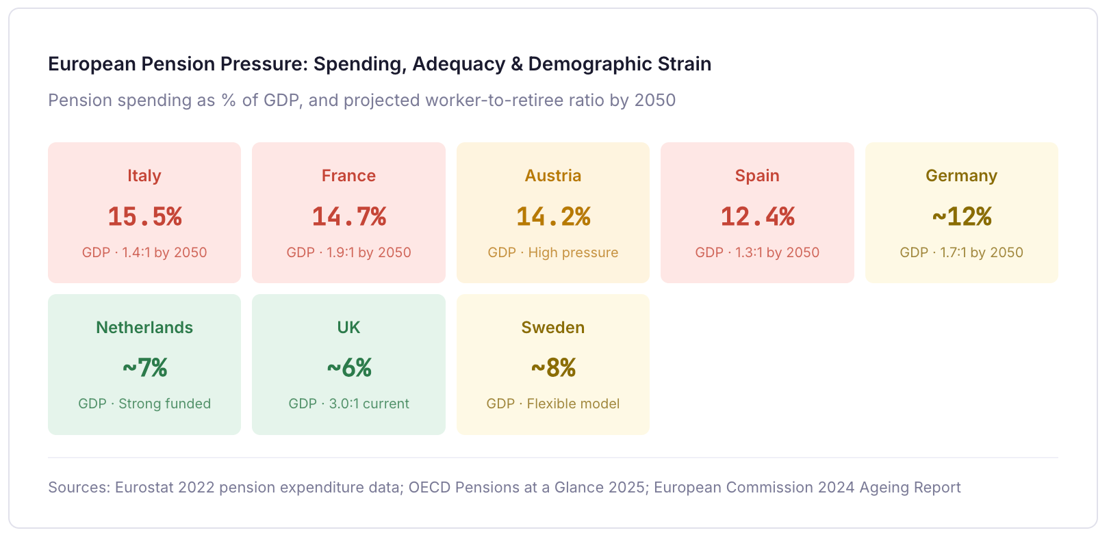 European pension systems spend 12–16% of GDP on public pensions, but aging demographics will push the old-age dependency ratio above 55% by 2050, threatening adequacy even where solvency is managed.