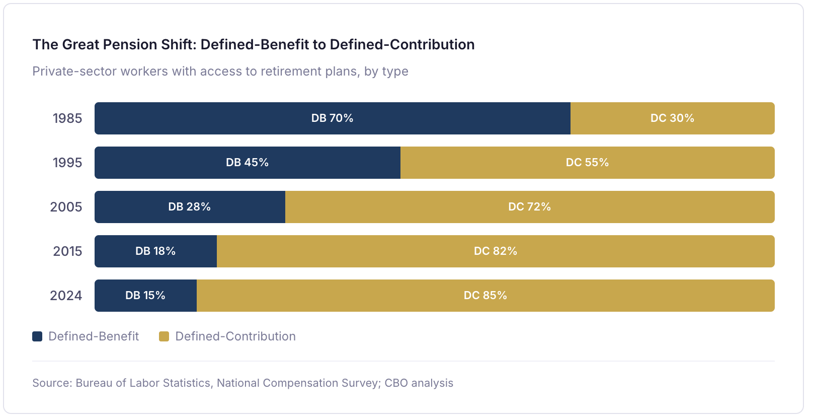 But the Social Security problem is only one dimension of the American retirement challenge. The second — and arguably more consequential — transformation has been the wholesale shift from defined-benefit to defined-contribution retirement plans. In the early 1980s, the majority of private-sector workers with retirement coverage had access to a traditional pension that guaranteed a specified monthly benefit for life. Today, only 15% of private-sector workers have access to a defined-benefit plan. The dominant vehicle is now the 401(k), a defined-contribution structure that places investment risk, longevity risk, and withdrawal-sequencing risk squarely on the individual participant.