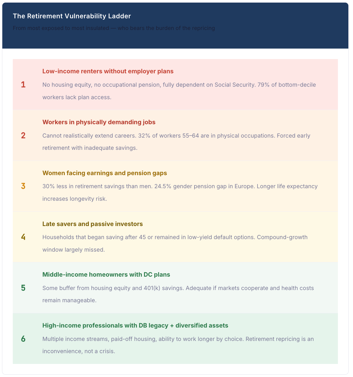 The repricing of retirement does not affect all households equally. It is, at its core, a distributional phenomenon. Wealthier households with diversified assets, employer-matched retirement accounts, and paid-off homes face a manageable adjustment. Lower-income households, renters, women, workers of color, and those in physically demanding occupations face a qualitatively different retirement — one that may be characterized less by leisure and security than by financial precarity and involuntary labor-force participation.