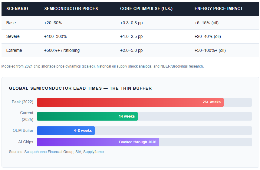 The inflationary transmission operates through two channels: direct semiconductor price spikes propagating into finished goods, and energy price shocks from shipping route disruption. During the 2021 chip shortage — approximately 10–15% of the supply loss in our Severe scenario — core inflation impact was estimated at 0.1–0.4 percentage points (Brookings). Supply chain disruptions during COVID accounted for ~40% of the increase in manufacturers’ unit cost expectations (NBER).