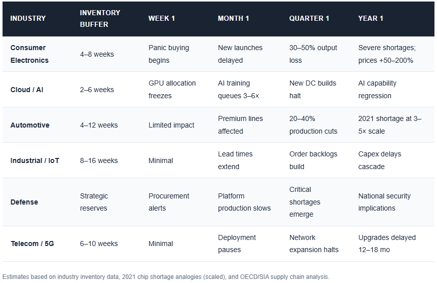 Inventory buffer is thin: Global semiconductor lead times have normalized to ~14 weeks, but most end-users hold only 4–8 weeks of chip inventory.