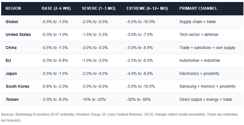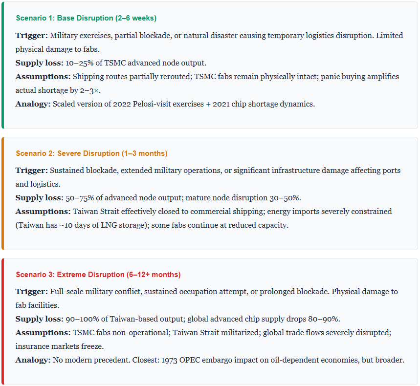 We model three disruption scenarios — Base (2–6 weeks), Severe (1–3 months), and Extreme (6–12+ months) — and estimate global GDP impacts ranging from 0.5–1.5% in the mildest case to 5–10% in a sustained disruption. Bloomberg Economics estimates a full Taiwan conflict at approximately $10 trillion in first-year costs. There is no near-term substitute: TSMC Arizona’s first advanced node fab is not expected to reach 2nm volume production until 2030, and Samsung and Intel remain years behind at cutting-edge nodes.