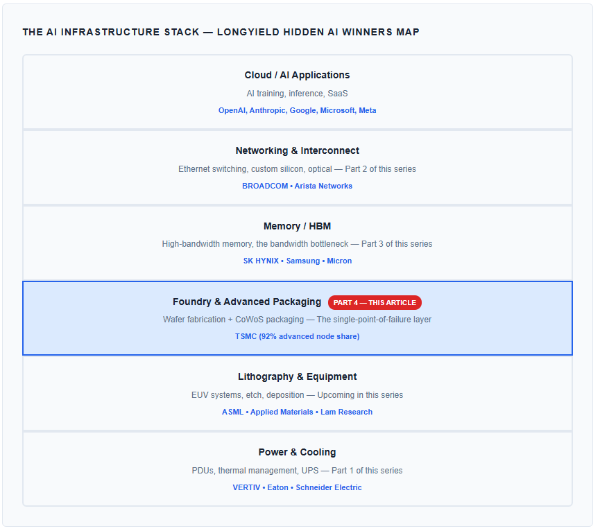 In Parts 1–3 of The Hidden AI Winners series, we mapped the critical infrastructure layers enabling the AI economy: power and cooling (Vertiv), networking and custom silicon (Broadcom), and high-bandwidth memory (SK Hynix). Each analysis identified a structural bottleneck where a small number of companies capture outsized economic value from the AI buildout.