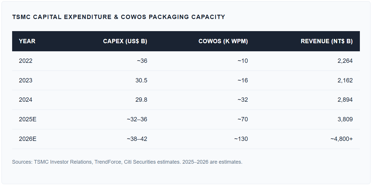 Beyond wafer fabrication, TSMC dominates advanced packaging — the process of integrating multiple chiplets, high-bandwidth memory (HBM), and logic dies into a single package. TSMC’s Chip-on-Wafer-on-Substrate (CoWoS) technology is the enabling platform for every major AI accelerator chip. CoWoS capacity reached ~32K wafers/month at end-2024, is projected at ~70K by end-2025, and ~130K by end-2026. Demand is growing at 113% annually, and capacity is fully booked through 2026. Advanced packaging has become the binding constraint on global AI compute scaling — not wafer fabrication itself.
