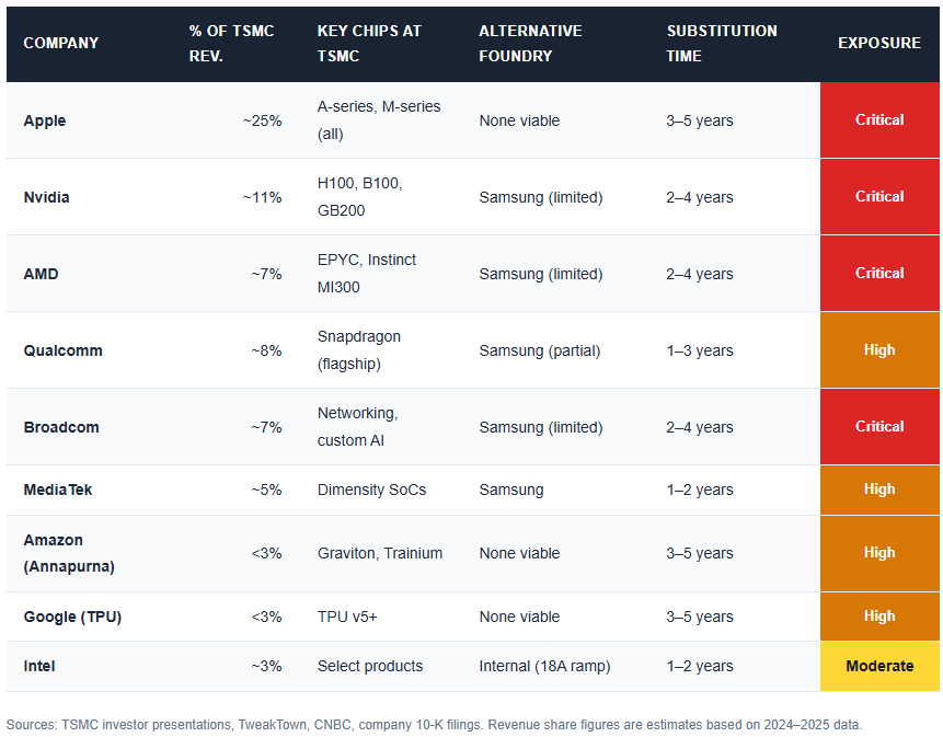 Customer lock-in: Apple (25% of TSMC revenue), Nvidia (11%), AMD (7%), Qualcomm (8%), and Broadcom (7%) have no viable alternative foundry for their most advanced chips.