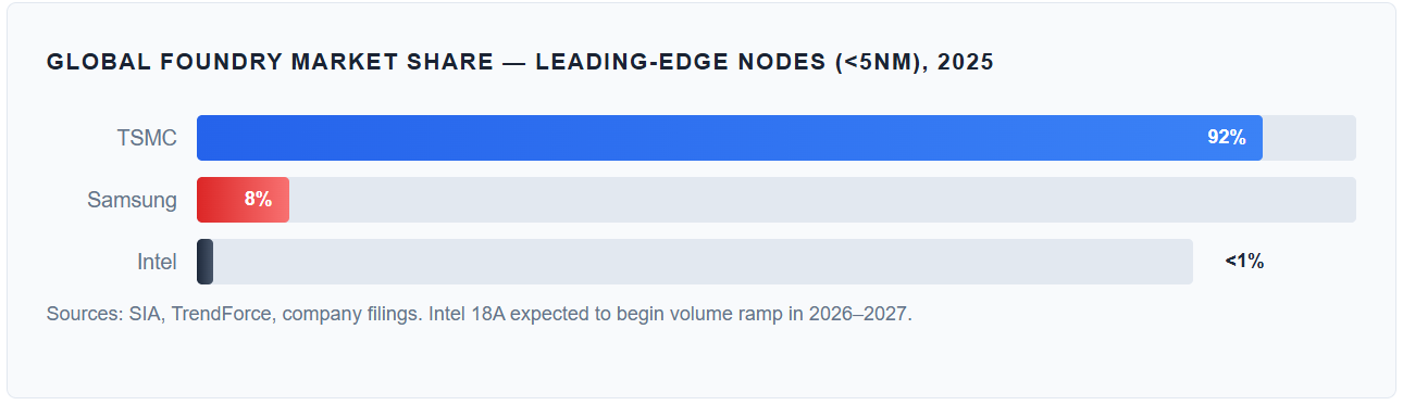 No fast substitution: Building a new leading-edge fab takes 3–4 years and costs $10B+. TSMC Arizona’s 2nm volume production is targeted for 2030.
