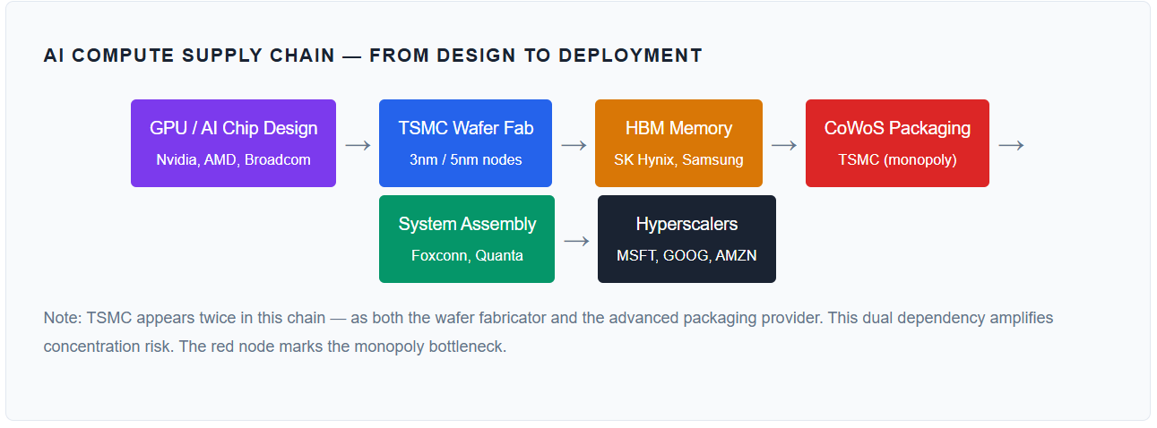 The concentration is starkest in AI infrastructure. Every major AI accelerator chip — Nvidia’s H100/B100, AMD’s MI300X, Google’s TPU, Amazon’s Trainium, Broadcom’s custom ASICs — is manufactured and packaged exclusively by TSMC. There is no second source. A TSMC disruption is, functionally, an AI compute disruption.