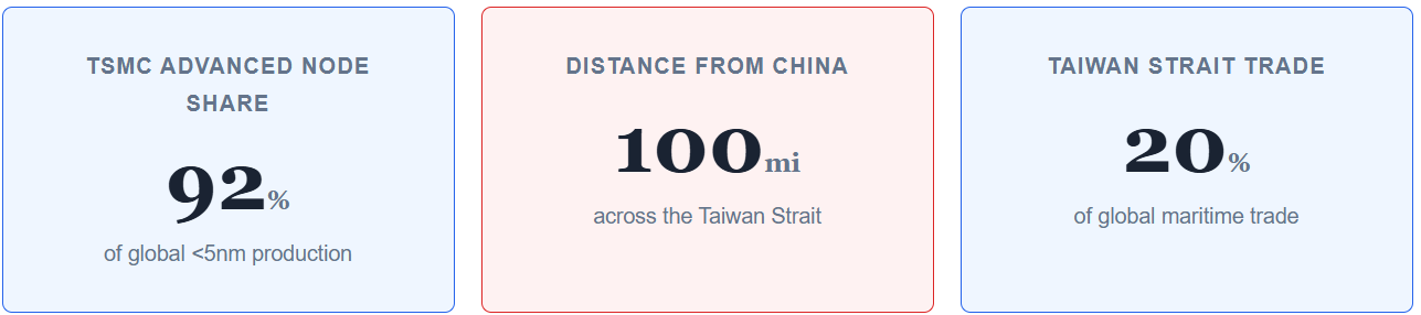 The global semiconductor supply chain has a structural single point of failure, and it sits on an island 100 miles from mainland China. Taiwan — specifically TSMC — controls the production of virtually all leading-edge logic chips that power smartphones, data centers, AI training infrastructure, advanced weapons systems, and autonomous vehicles.
